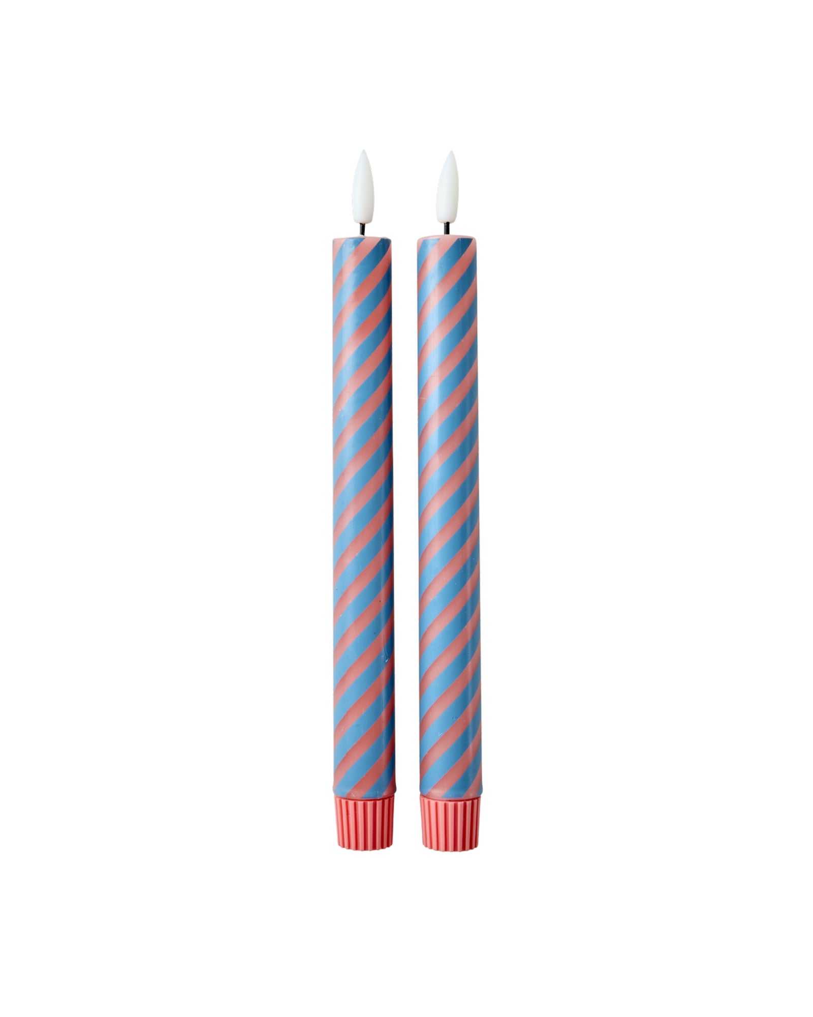 Les plus merveilleuses bougies LED dans une magnifique association de rayures colorées – corail et pétrole. Dimensions : 25 cm. En lot de deux, elles réchaufferont n’importe quelle pièce avec le vacillement réaliste de leur flamme… elles ont juste besoin de deux piles AAA (non fournies).